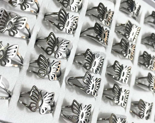 SILVER STAINLESS STEEL LARGE BUTTERFLY RING-Set of 36