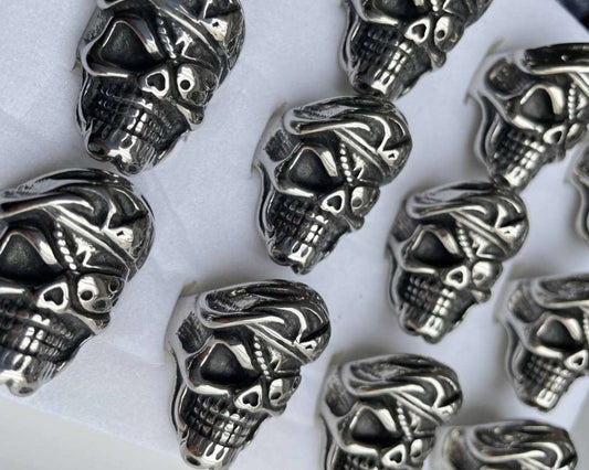 SILVER STAINLESS STEEL PIRATE SKULL RING- Set of 12