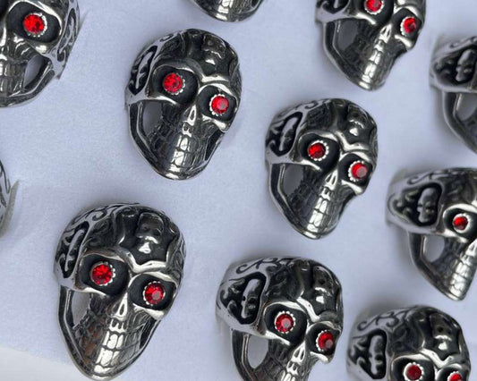SILVER STAINLESS STEEL RED EYE SKULL RING- Set of 12