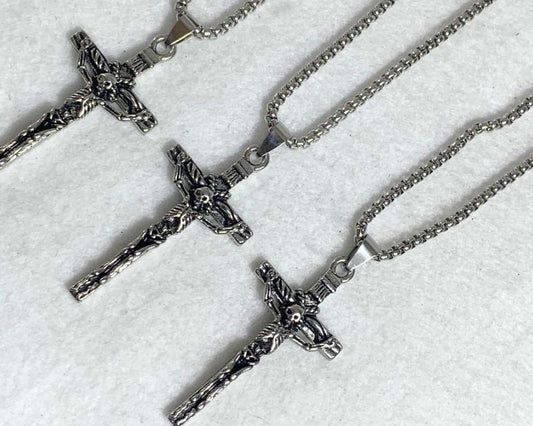 SILVER STAINLESS STEEL NECKLACE CROSS SKULL – Set of 12