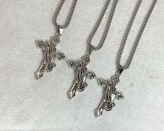 SILVER STAINLESS STEEL NECKLACE CROSS WITH HANDS– Set of 12