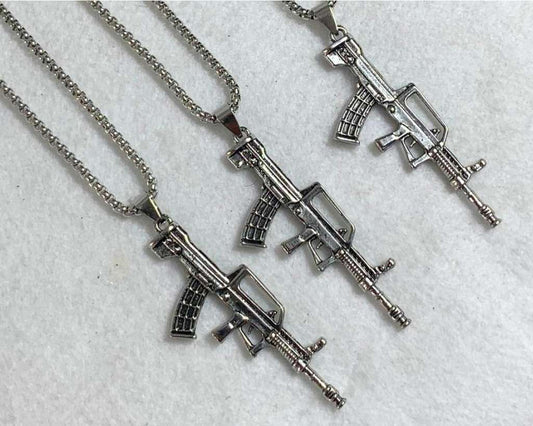 SILVER STAINLESS STEEL NECKLACE MACHINE GUN – Set of 12