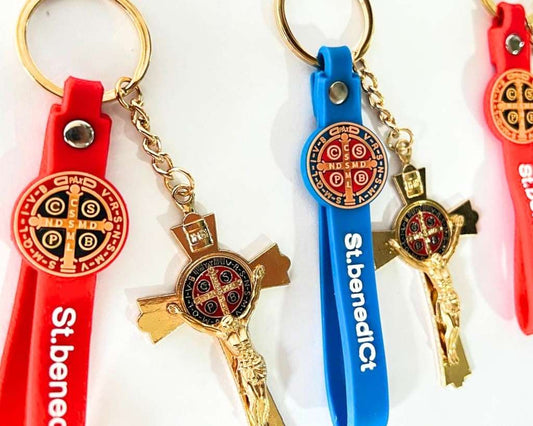 GOLDEN KEYCHAIN SAINT BENEDICT MEDAL BLACK OR SKY BLUE- Set of 12