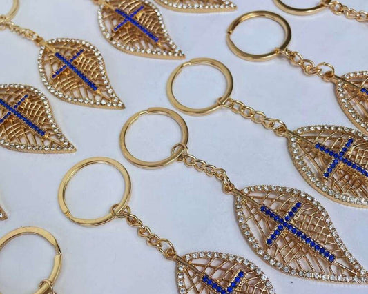GOLDEN KEYCHAIN LEAF WITH CROSS – Set of 12