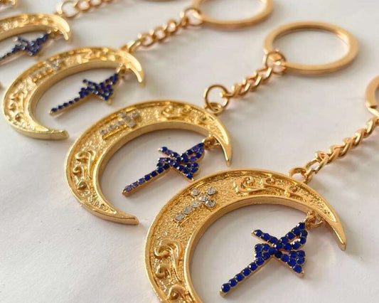 GOLDEN KEYCHAIN MOON WITH CROSS FAITH BLUE RHINESTONES-Set of 12