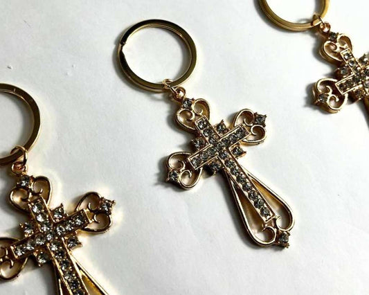 GOLDEN CROSS KEYCHAIN WITH RHINESTONES – Set of 12