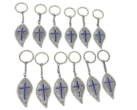 SILVER KEYCHAIN LEAF WITH CROSS – Set of 12
