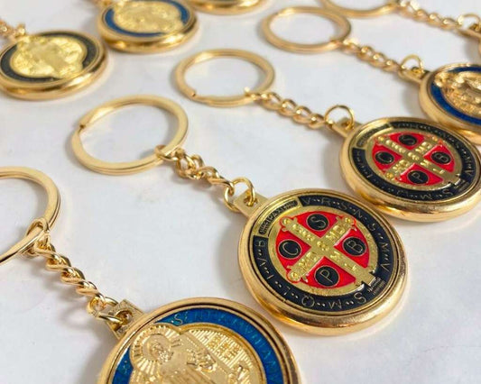 GOLDEN KEYCHAIN SAINT BENEDICT MEDAL BLACK OR SKY BLUE- Set of 12