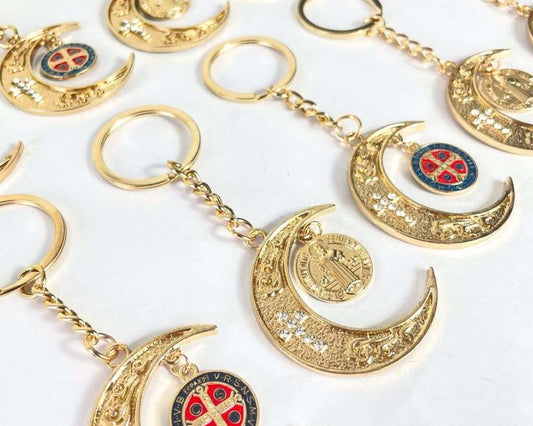 GOLDEN KEYCHAIN MOON WITH SAINT BENEDICT MEDAL-Set of 12