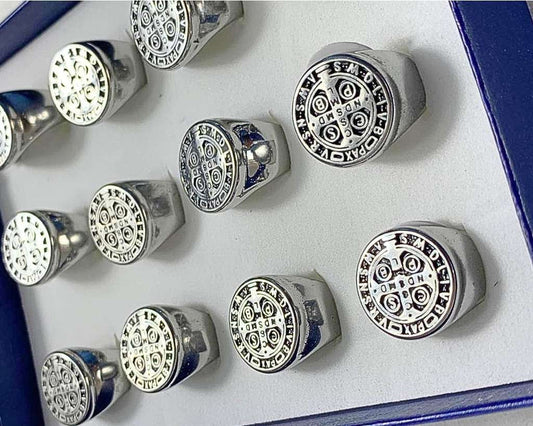 SILVER STAINLESS STEEL RING SAINT BENEDICT MEDAL – Set of 12