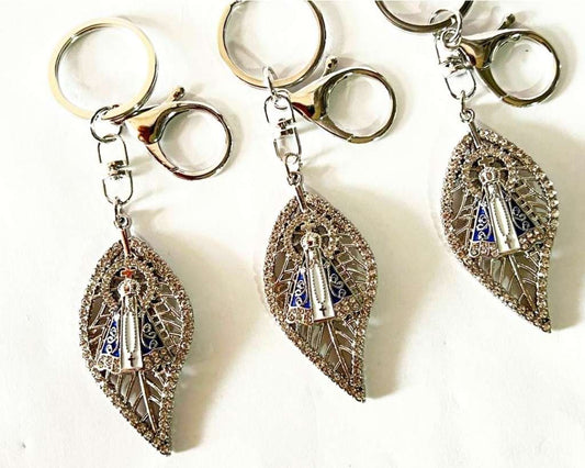SILVER STAINLESS STEEL KEYCHAIN O.LADY APPARITIONS LEAF WITH RHINESTONES – Set of 12