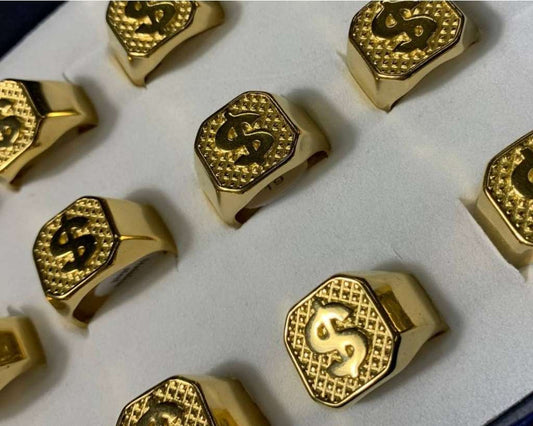 GOLDEN STAINLESS STEEL RING DOLLAR SIGN WITH TEXTURE – Set of 12