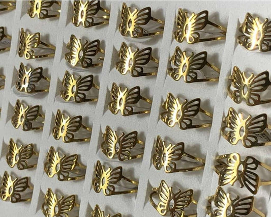 LARGE GOLDEN STAINLESS STEEL BUTTERFLY RING – Set of 36