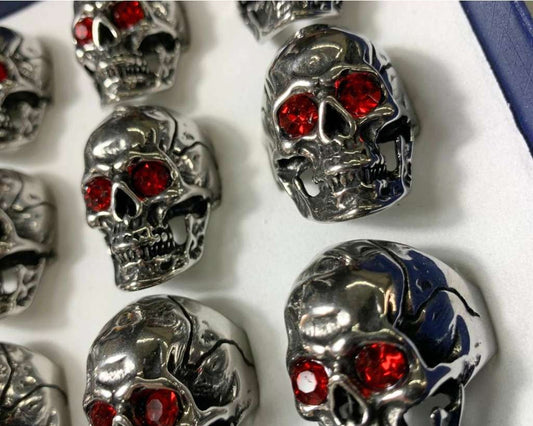 RED EYES SILVER SKULL STAINLESS STEEL RING WITH DETAILS – Set of 12