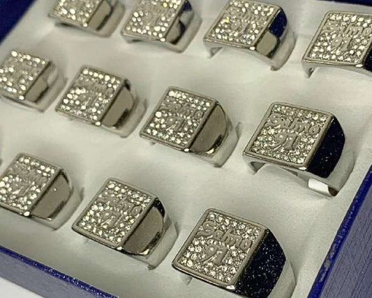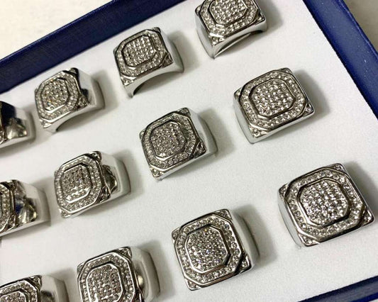 SILVER STAINLESS STEEL RING SQUARE WITH STUDDED RHINESTONES – Set of 12