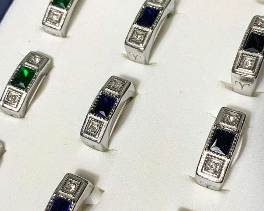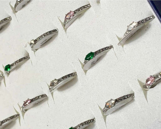 SILVER STAINLESS STEEL THIN RING WITH COLORED STONE RHINESTONES – Set of 24