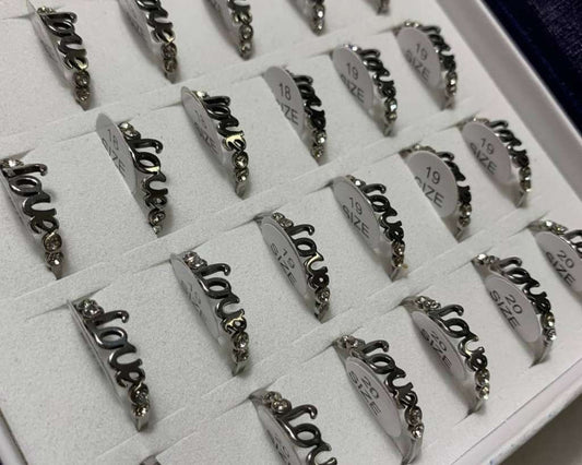 SILVER STAINLESS STEEL LOVE RING WITH ROCKS- Set of 36