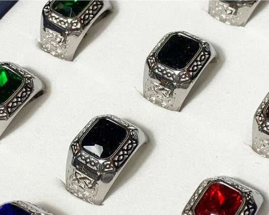 SILVER STAINLESS STEEL RING WITH COLORED STONE WITH TEXTURES – Set of 12